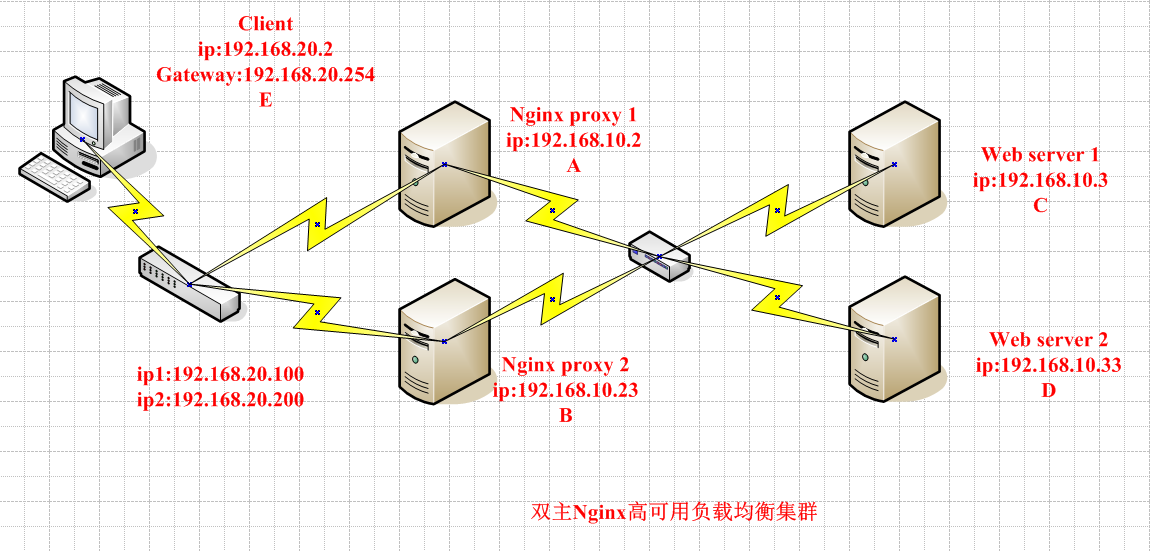 实验环境:两台Nginx proxy(双主Nginx,各需要两块网卡,eth0连接内网,eth1连接外网)、两台web server(请求的负载均衡)、一台client用于验证结果。