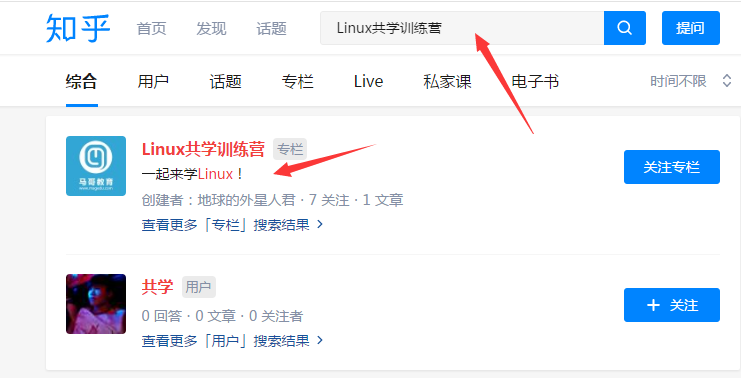 知乎首页搜索<Linux共学训练营>,选择下图所示专栏,点击关注。