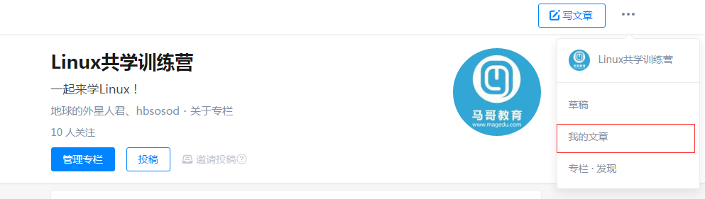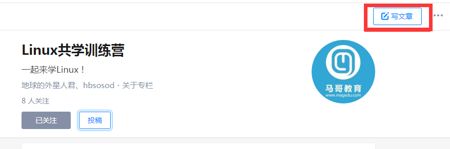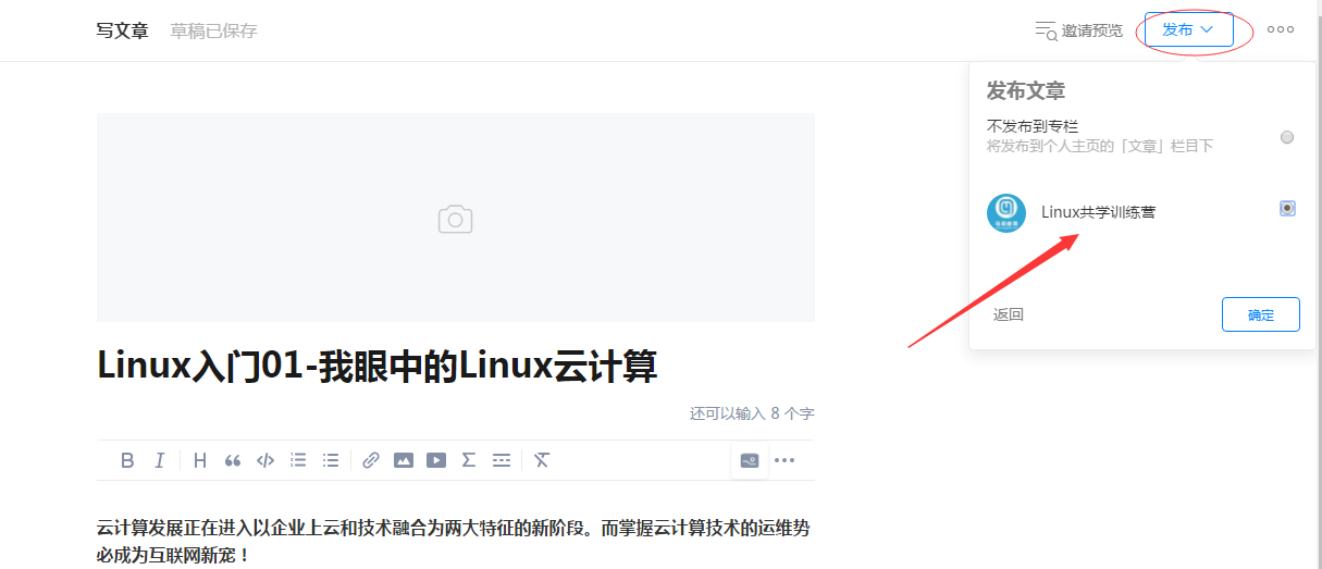 完成文章后,点击右上角发布,并选择Linux共学训练营专栏即可。