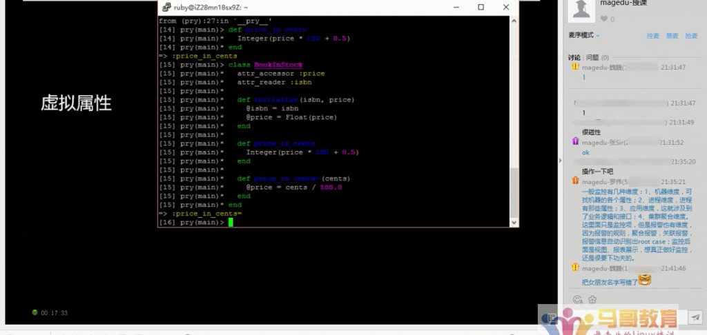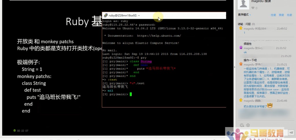 本期(总第98期)yy分享主题一:《作为Ruby开发的我如何挑战运维》非常感谢章鱼加入“马哥教育YY讲师团”,并为大家带来一场精彩的技术分享。昨晚YY课堂往期班,章鱼老师将基础知识和详细实操相结合,从Ruby国内前景、Ruby基础以及Rails介绍等方面带领伙伴们探索了《作为Ruby开发的我如何挑战运维》,赢得了小伙伴们的一致好评。特发小礼品一份,以资鼓励!视频猛戳:http://osstep.com/course/50