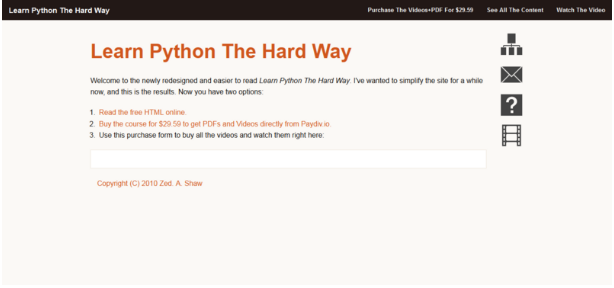 非常像LPTHW(笨办法学Python),但是在如何制定完整的学习计划并实施,以及如何迈出第一步上提供了更深层次的引导,而不会让你丧失自信心。对于那些想学Python的人来说它被认为是最好的初学者教程之一,当然你要先看看前几章,是否喜欢它的写作风格。