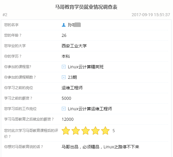 马哥教育《学员喜讯》栏目是为真实公布学员就业信息的栏目,记录每一个为求改变的个体在马哥教育经过4个月努力后的惊喜时刻,我们来看看本期学员: