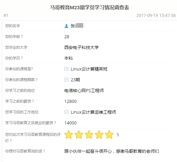 马哥教育《学员喜讯》栏目是为真实公布学员就业信息的栏目,记录每一个为求改变的个体在马哥教育经过4个月努力后的惊喜时刻,我们来看看本期学员: