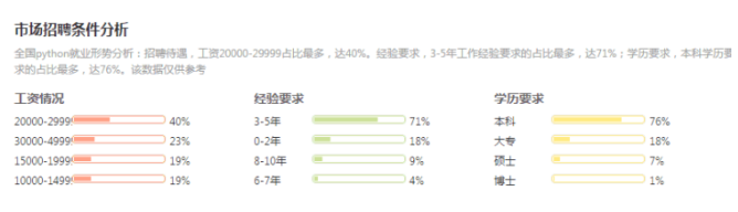 全国Python就业形势分析:招聘待遇,工资20000-29999占比最多,达40%。经验要求,3-5年工作经验要求的占比最多,达71%;学历要求,本科学历要求的占比最多,达76%。该数据仅供参考