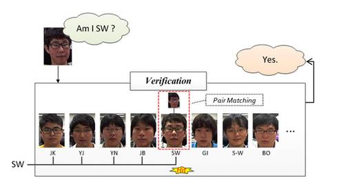 Face verification,人脸校验是基于pair matching的方式,所以它得到的答案是“是”或者“不是”。在具体操作的时候,给定一张测试图片,然后挨个进行pair matching,matching上了则说明测试图像与该张匹配上的人脸为同一个人的人脸。一般在小型办公室人脸刷脸打卡系统中采用的(应该)是这种方法,具体操作方法大致是这样一个流程:离线逐个录入员工的人脸照片(一个员工录入的人脸一般不止一张),员工在刷脸打卡的时候相机捕获到图像后,通过前面所讲的先进行人脸检测,然后进行人脸校正,再进行人脸校验,一旦match结果为“是”,说明该名刷脸的人员是属于本办公室的,人脸校验到这一步就完成了。在离线录入员工人脸的时候,我们可以将人脸与人名对应,这样一旦在人脸校验成功后,就可以知道这个人是谁了。上面所说的这样一种系统优点是开发费用低廉,适合小型办公场所,缺点是在捕获时不能有遮挡,而且还要求人脸姿态比较正(这种系统我们所有,不过没体验过)。下图给出了示意说明: