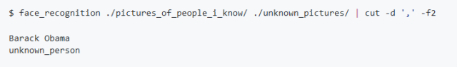 当你安装face_recognition,你能得到一个简洁的叫做face_recognition的命令行程序,它能帮你识别一张照片或是一个照片文件夹中的所有人脸。
