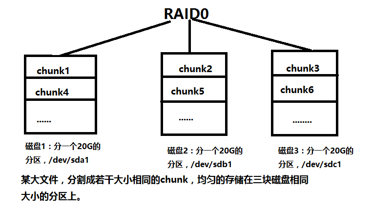 RAID0:条带卷(striping),至少需要两块磁盘,做RAID分区的大小最好是相同的(也可以用相同大小的 两块磁盘直接做 RAID);把数据分割成若干个相同大小的chunk,依次均匀的存储在不同的磁盘 上,在读写的时候可以实现并发,所以读、写性能好;但是没有容错功能,任何一块磁盘损坏,将导 致全部数据的损坏。磁盘利用率100%。