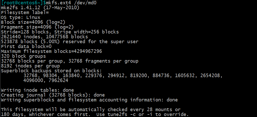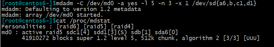 #mdadm -C /dev/md0 -a yes -l 1 -n 2 /dev/sd{a6,b}
