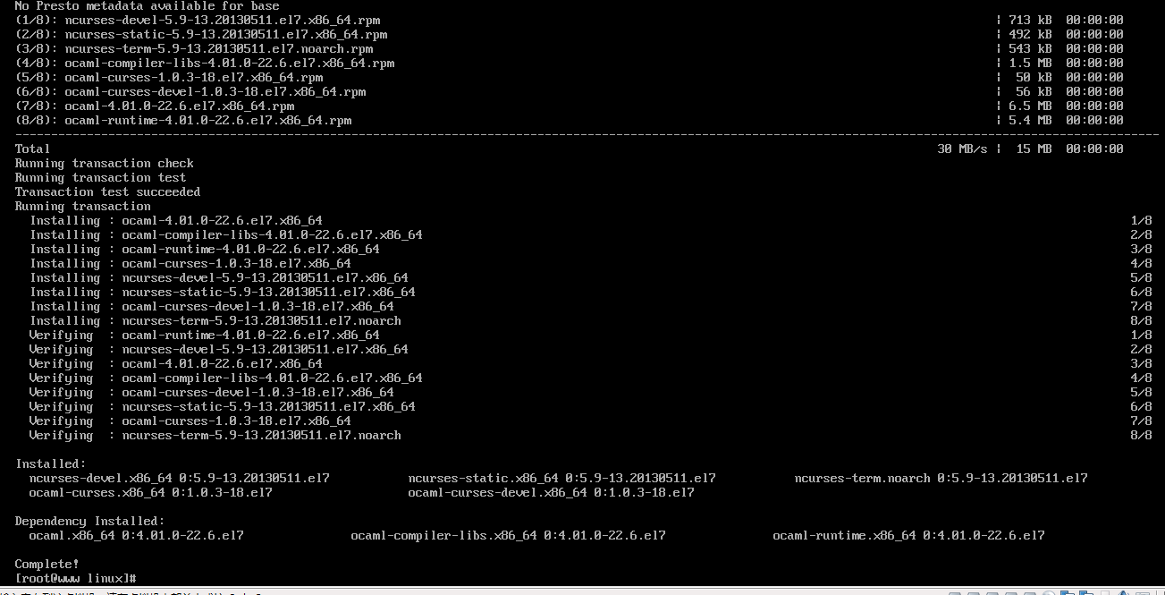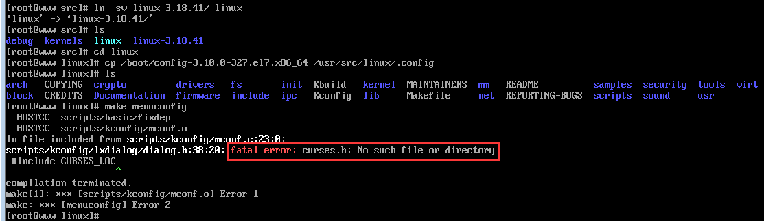 运行make menuconfig命令来配置内核选项,如果此处有报错的话,例如下图,表明一些编译内核的工具还没有安装,此处我们通过yum仓库来安装一下相关的文件,此处除了报错的curses.h的文件以外,还有