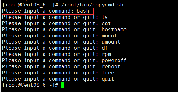 注意:此处的copycmd.sh是自己编写的脚本,内容就是复制bash和ls之类这些相关的文件到/sysroot下面,当然,此处也可以自行一个一个复制,只是比较麻烦