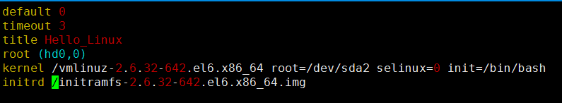 kernel /vmlinuz-2.6.32-642.el6.x86_64 root=/dev/sda2 seLinux=0 init=/bin/bash