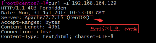 在客户端机器连接服务器时,显示出Apache版本信息,不安全。