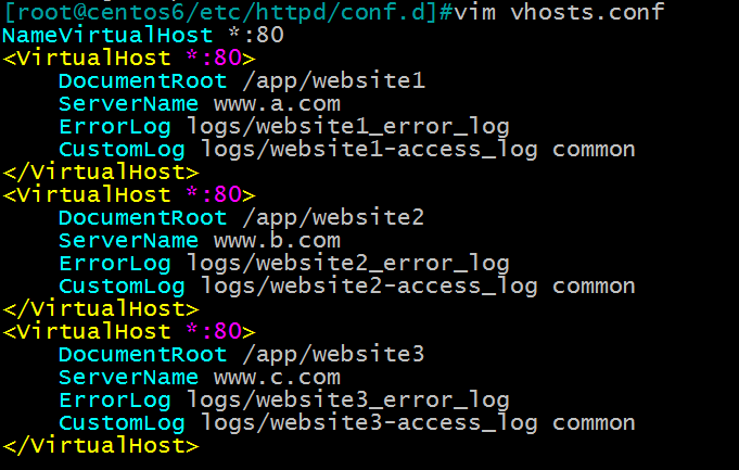 <VirtualHost IP:PORT>ServerName FQDNDocumentRoot “/path”</VirtualHost>建议:上述配置存放在独立的配置文件中