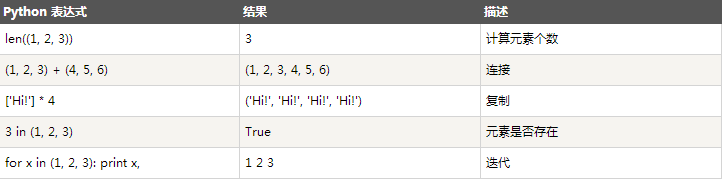 print len([1, 2, 3]); #3 print [1, 2, 3] + [4, 5, 6]; #[1, 2, 3, 4, 5, 6] print ['Hi!'] * 4; #['Hi!', 'Hi!', 'Hi!', 'Hi!'] print 3 in [1, 2, 3] #True for x in [1, 2, 3]: print x, #1 2 3