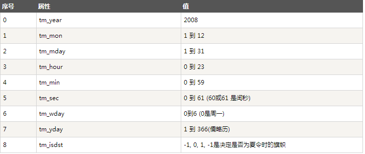 说明:time.struct_time(tm_year=2014, tm_mon=3, tm_mday=21, tm_hour=15, tm_min=13, tm_sec=56, tm_wday=4, tm_yday=80, tm_isdst=0)属于struct_time元组,struct_time元组具有如下属性: