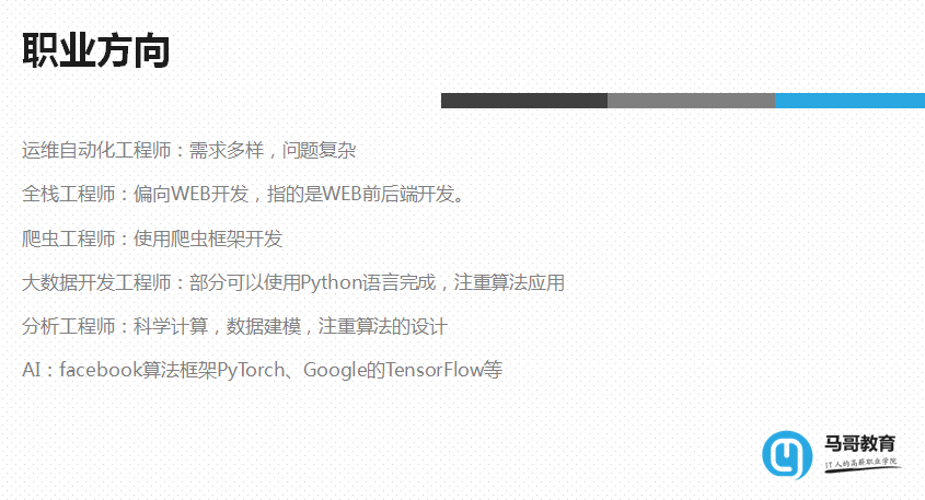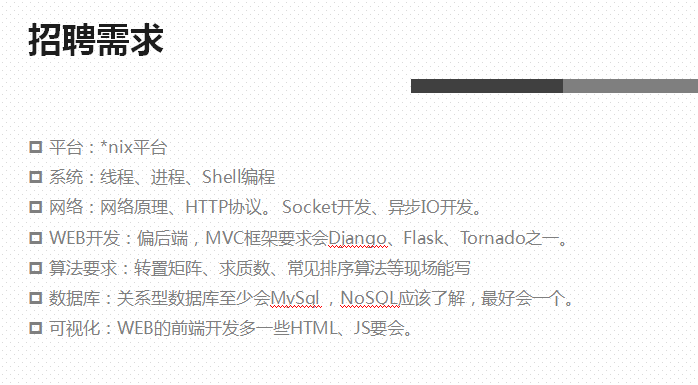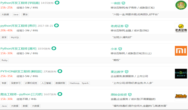 所以如果你要学习一个课程,一定要看他的课程体系是否完整,这样对你找工作有非常大的好处,其次如果你不辛学习了一个不太靠谱的课程,可以按照这个技能补充你的技能。目前来看,市面上关于Python的岗位如下: