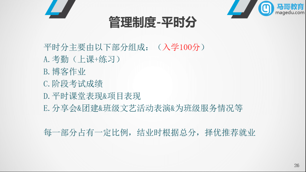 我们的管理制度很严格!每一部分占有一定比例,结业时根据总分,择优推荐就业!