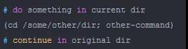 o 在bash脚本中,subshells (写在圆括号里的)是一个很方便的方式来组合一些命令。一个常用的例子是临时地到另一个目录中,例如: