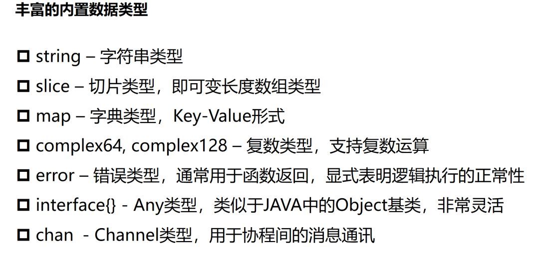 GO语言作为编译型语言,在数据类型上也支持得非常全面,除了传统的整型、浮点型、字符型、数组、结构等类型外。从实用性上考虑,也对字符串类型、切片类型(可变长数组)、字典类型、复数类型、错误类型、管道类型、甚至任意类型(Interface{})进行了原生支持,并且用起来非常方便。比如字符串、切片类型,操作简便性几乎和Python类似。