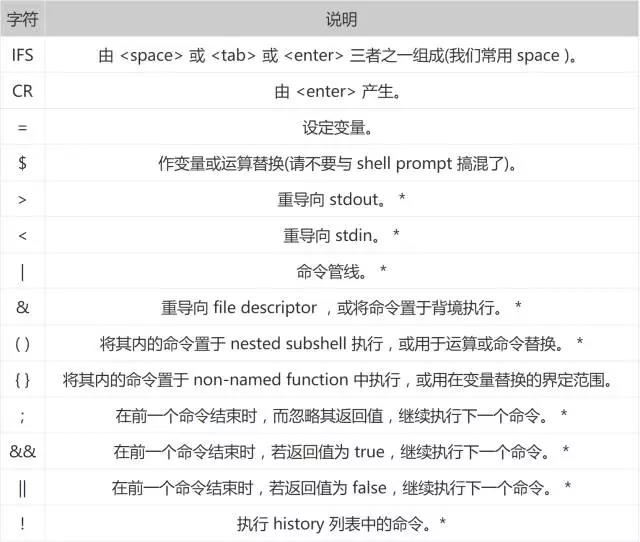 shell除了有通配符之外,由shell负责预先先解析后,将处理结果传给命令行之外,shell还有一系列自己的其他特殊字符。