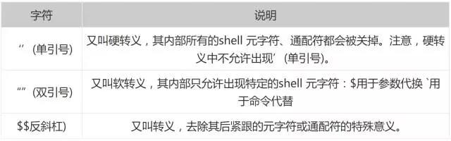 如果用双引号包括起来,shell检测跳过了1-4步和9-10步,单引号包括起来,shell检测就会跳过了1-10步。也就是说,双引号 只经过参数扩展、命令代换和算术代换就可以送入执行步骤,而单引号转义符直接会被送入执行步骤。而且,无论是双引号转义符还是单引号转义符在执行的时候能够告诉各个命令自身内部是一体的,但是其本身在执行时是并不是命令中文本的一部分。