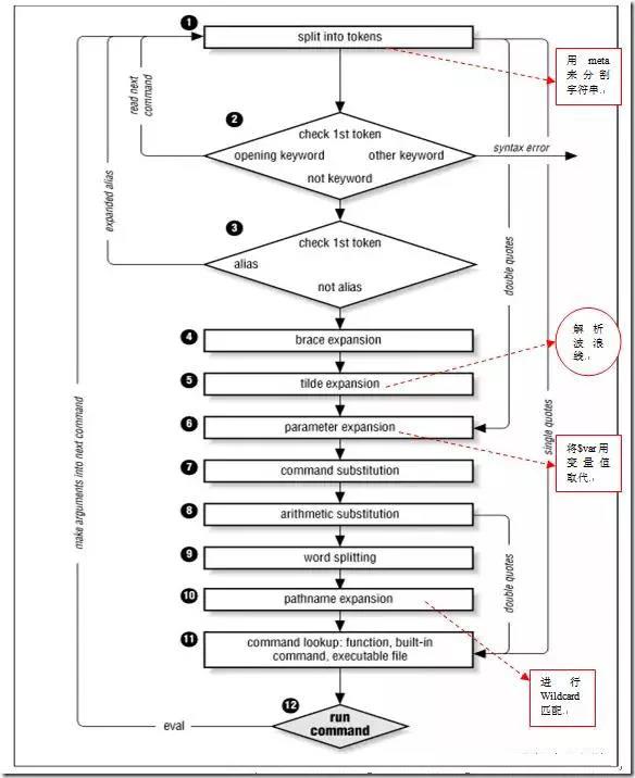看到上面说的这些,想必大家会问到这个问题是,有这么想特殊字符,通配符,那么shell在得到一条命令,到达是怎么样处理的呢?我们看下下面的图: