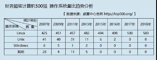 根据权威机构统计,近几年全球超级计算机500强所使用的操作系统系统趋势分析图如下: