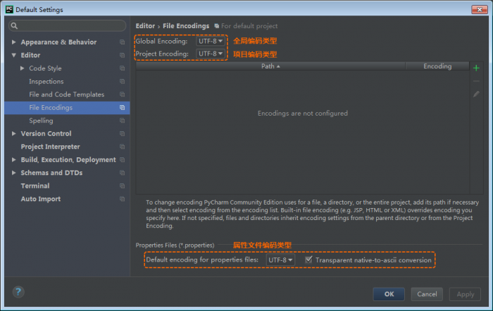 并且,在PyCharm2017中,我们也可以在文件(File)-系统默认设置(Default Settings)-编辑器(Editor)-文件编码(File Encodings)中,设置全局编码类型、项目编码类型以及属性文件的编码类型。新创建的项目将会自动采用默认设置中的编码类型。