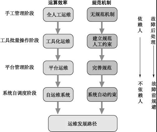 在整个运维的发展过程中,希望所有的工作都自动化起来,减少人的重复工作,降低知识传递的成本,使我们的运维交付更高效、更安全,使产品运行更稳定。对于故障的处理,也希望由事后处理变成提前发现,由人工处理变成系统自动容灾。