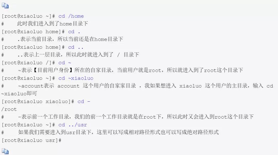 通过上面的几个实例我们应该对cd这个命令有了深入的了解了,而且也知道了那几个特殊目录所代表的含义。