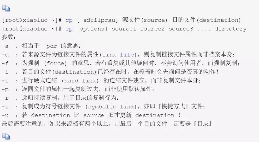 要复制文件,我们就要用到cp(copy)命令。不过cp命令的用途非常的广泛,除了单纯的复制之外,还可以建立连接文件(相当于windows下的快捷方式),比较两个文件的新旧而予以更新,以及复制整个目录等等。