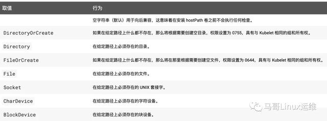 配置hostPath存储卷的嵌套字段共有两个:一个是用于指定工作节点上的目录路径的必须按字段path 一个是指定存储卷类型的type,它支持使用的卷类型包含如下几种:
