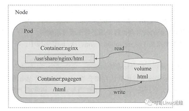 上面示例中定义的存储卷名称为html,挂载于容器nginx的 /usr/share/nginx/html目录,以及容器pagegen的/html目录。容器pagegen每隔10秒向存储卷上的index.html文件中追加一行信息,而容器nginx中的nginx进程则以其站点主页。如下图所示:
