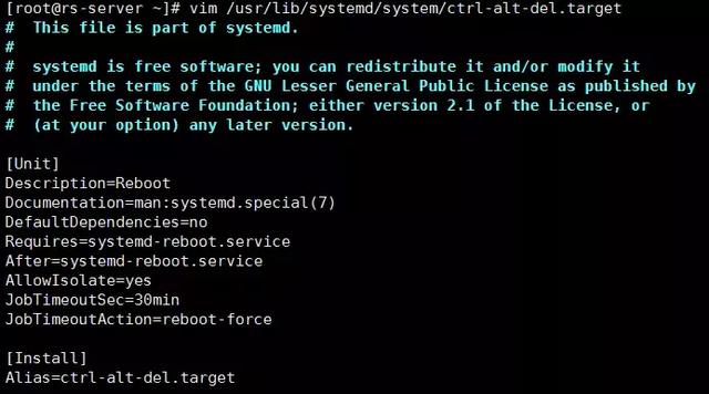 [root@rs-server ~]# ll /usr/lib/systemd/system/ctrl-alt-del.target lrwxrwxrwx. 1 root root 13 Mar 14 17:27 /usr/lib/systemd/system/ctrl-alt-del.target -> reboot.target