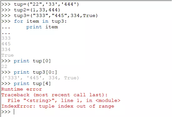 可以使用下标对元组进行访问,注意下标可以访问多个元素,也可访问一个元素。还要注意下标不要越界。