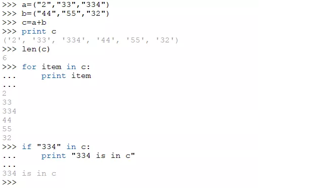 元组一旦声明好后,就不能修改了,但是元组可以使用del函数将整个元组值删除掉。使用in函数来判断元组中是否包含某个特定字符。使用+符号来合并元组,使用len函数来计算长度,使用for来遍历元组。我们来看一下测试代码。