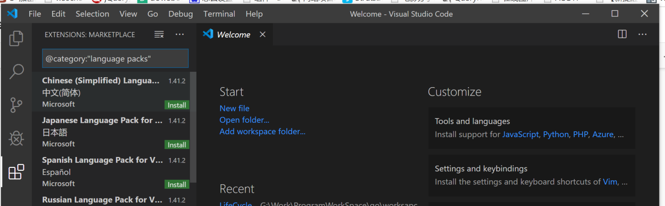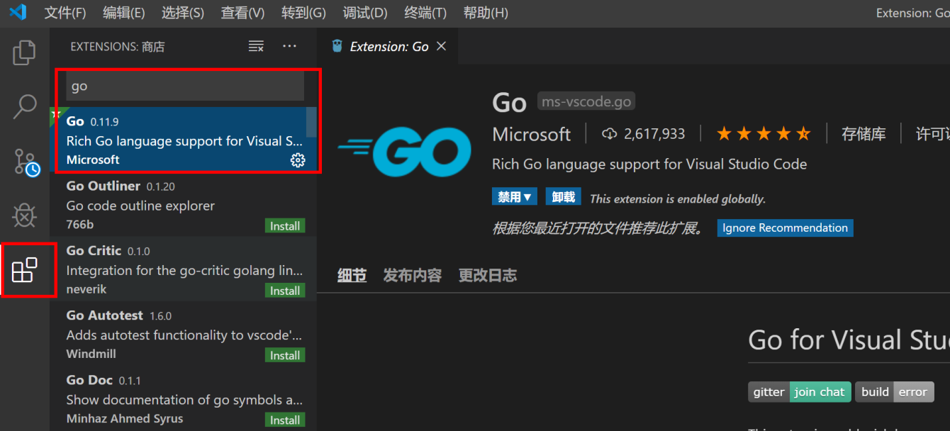 最后一步就是在 VSCode 中安装 Go 语言的高亮插件,在插件库搜索 go,第一个就是,直接点击安装即可: