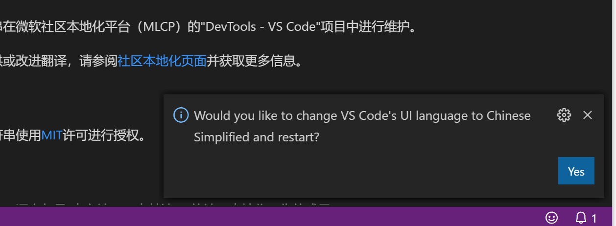 选择第一个简体中文,点击右下角的 install ,安装成功之后会要求你重新启动 VSCode ,点击 Yes ,会自动重启 VSCode。