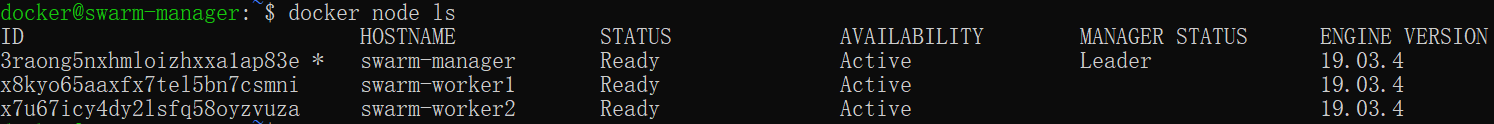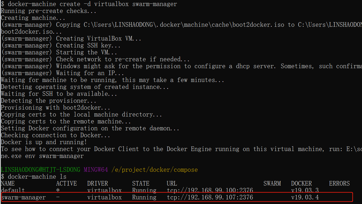 $ docker-machine ssh swarm-manager $ docker swarm init --advertise-addr 192.168.99.107 #这里的 IP 为创建机器时分配的 ip。