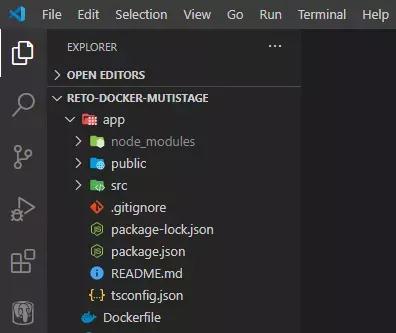 让我们从一个示例开始,在该示例中,我们构建了一个 React 应用程序并将其容器化。运行 npx 命令并创建 Dockerfile 之后,我们得到了如图 1 所示的文件结构。