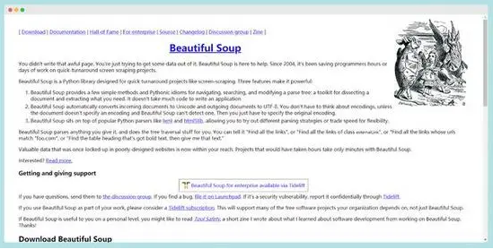 Beautiful Soup 是用Python写的一个HTML/XML的解析器,它可以很好的处理不规范标记并生成剖析树(parse tree)。它提供简单又常用的导航(navigating),搜索以及修改剖析树的操作,它能够通过你喜欢的转换器实现惯用的文档导航,查找,修改文档的方式,简单的说,它可以大大节省你的编程时间