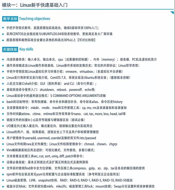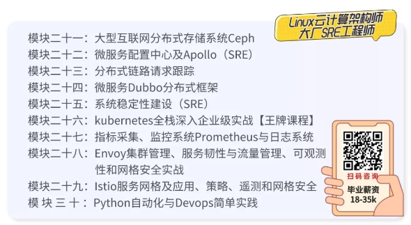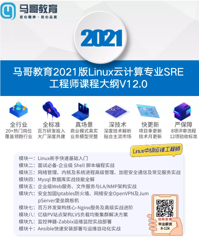 2021课程全新升级为专业Linux云计算SRE课程体系(站点可靠性工程师),对标阿里P7!优化了30个关键技能模块,既能满足零基础入门学习,也满足在职人员跳槽加薪提升,新课程配套实验环境与手册 20+项企业实战项目案例;更新优化幅度达40%,超出市面其他机构30%。