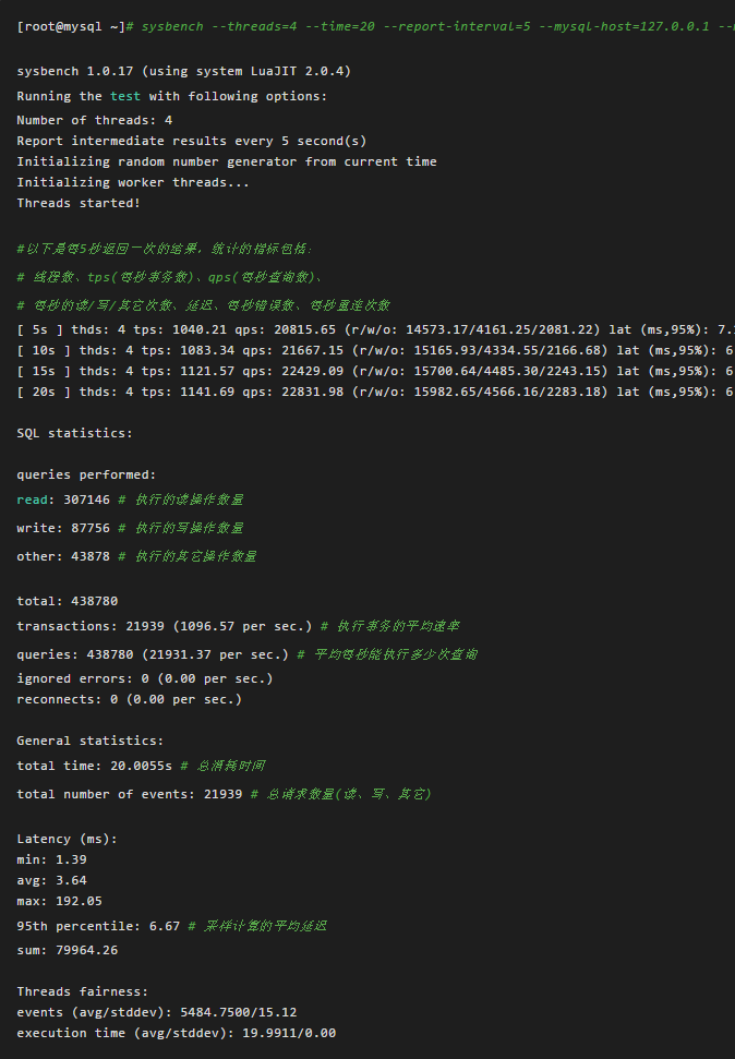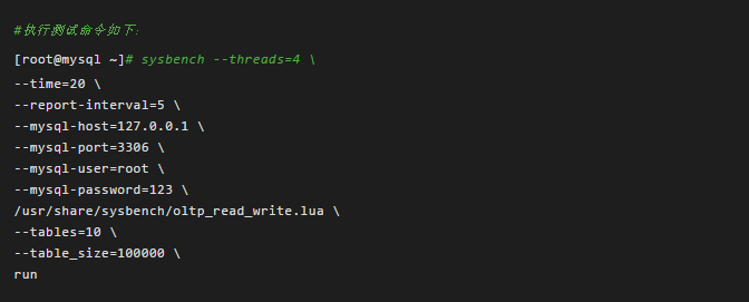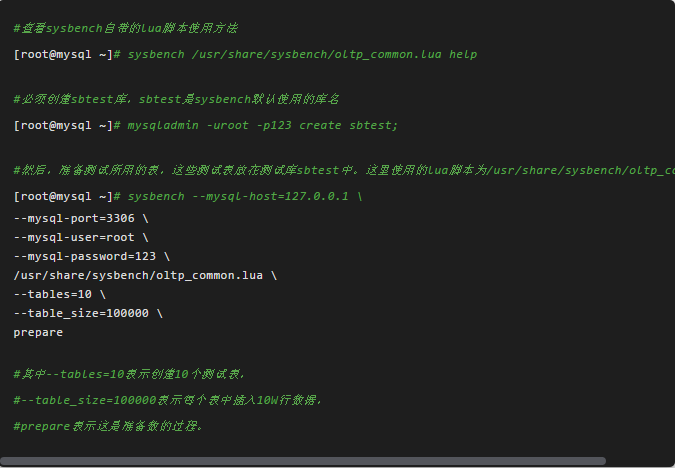 稍微修改下之前准备数据的语句,就可以拿来测试了。需要注意的是,之前使用的lua脚本为oltp_common.lua,它是一个通用脚本,是被其它lua脚本调用的,它不能直接拿来测试。