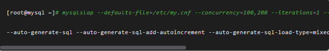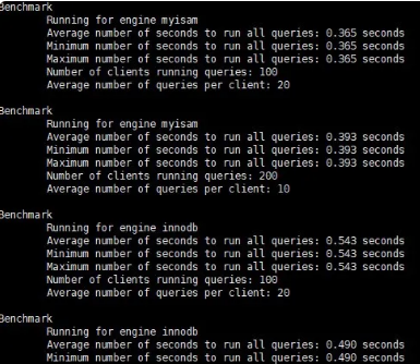 上述命令测试说明:模拟测试两次读写并发,第一次100,第二次200,自动生成SQL脚本,测试表包含20个init字段,30个char字段,每次执行2000查询请求。测试引擎分别是myisam,innodb。(上述选项中有很多都是默认值,可以省略,如果想要了解各个选项的解释,可以使用mysqlslap --help进行查询)。