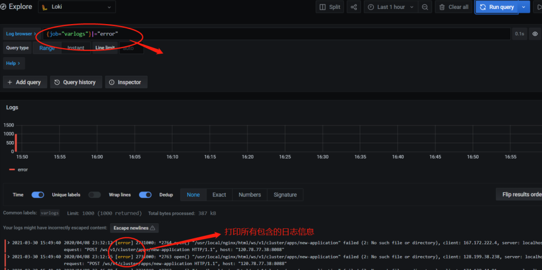3、在日志的收集以及可视化上可以连用grafana,实现在日志上的筛选以及查看上下行的功能。