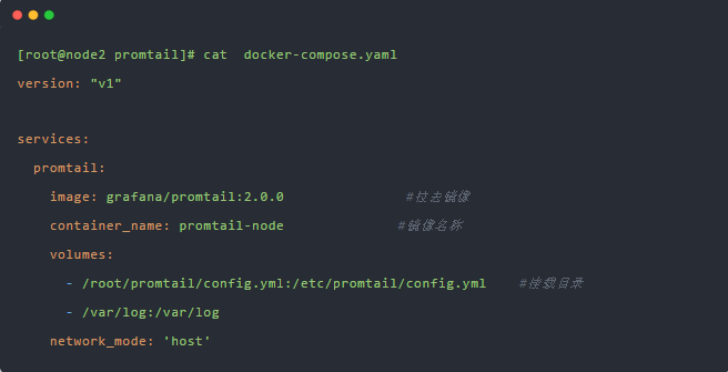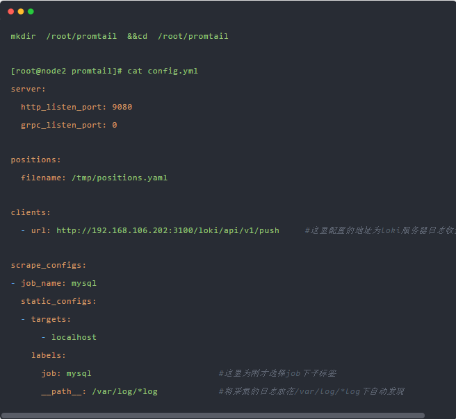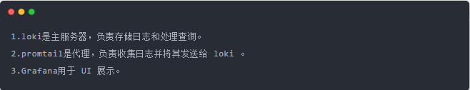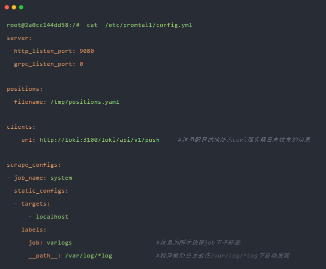 promtail容器为日志采集容器,配置文件在promtail容器/etc/promtail/config.yml,将该容器部署在需要采集日志的服务器上就能正常采集日志传回loki服务收集整理