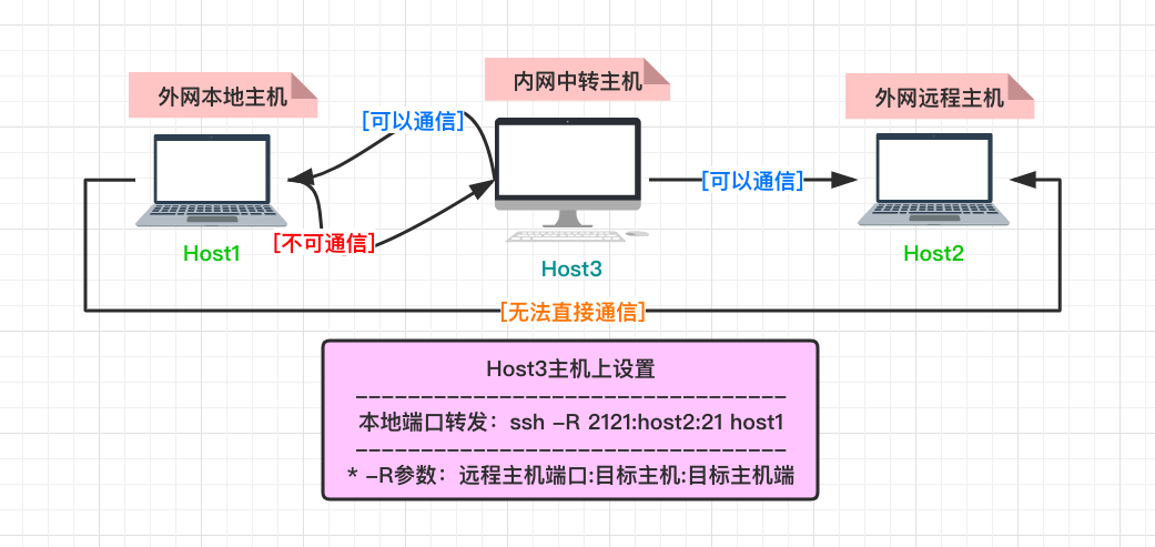 比如我们在 host2 机器上面部署了很多服务,但是由于某种原因导致我们无法直接 ssh 访问该服务器已经其上服务的对应端口,但是 host3 服务器,既能够访问 host2 服务器,又可以访问我们的 host1 服务器。这时,我们可以通过设置 ssh 来进行服务的访问。但是还有两个问题:你需要保持终端开启防止 SSH 进程被关闭;由于网络故障/波动导致 SSH 终断时无法自动重连。