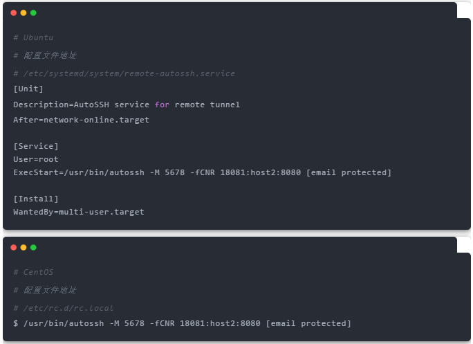 Ubuntu或CentOS系统中,我们使用systemd来管理autossh的开机启动问题。配置很简单,只需要创建一个如下服务启动配置文件,即可。旧版本中可以使用init.d来管理方式,只需要添加对应命令到rc.local文件,即可。