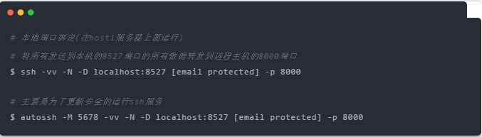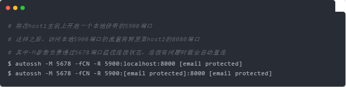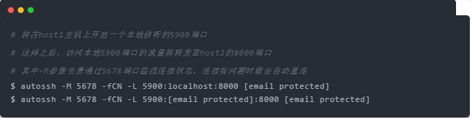 autossh确实是最佳选择。但是如果需要映射大量端口,建议还是使用类似Ngrok的端口映射工具,毕竟这类工具拥有比较完善的管理功能。[1] 本地端口绑定和转发 (-L) => 在 host1 上面设置