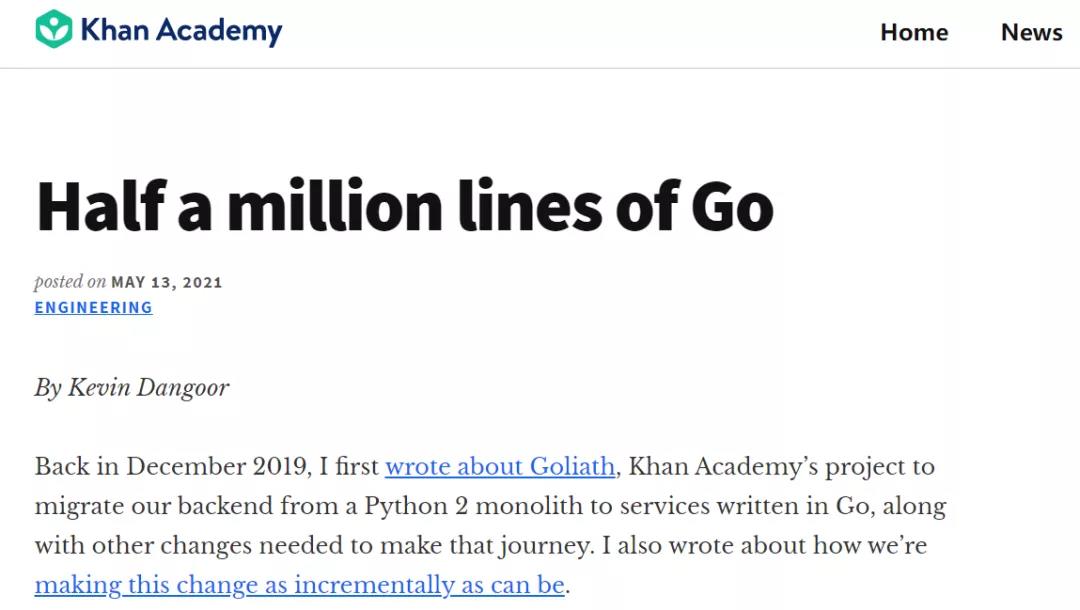 Python 2 于 2020 年初到达 EOL 阶段;鉴于此,可汗学院计划进行大规模迁移。对此,可汗学院的首席软件架构师 Kevin Dangoor 曾表示,从 Python 2 迁移到 3 并不是一件容易的事。他的团队曾认为 Kotlin 是一个有吸引力的选择,但最终还是选择了 Go;其工程师认为,和 Python 3 相比,Go 具有很大的性能优势。“由于 Go 的编译速度快得惊人,我们可以更快地进行迭代。此外,我们的团队成员拥有多年的经验和围绕许多不同编辑器建立的肌肉记忆。Go 比 Kotlin 更受各种编辑器的支持。”很多可汗学院的工程师反馈称,Go 很容易写和读,并表示自己越是使用 Go 就越喜欢它。同时,Go 的错误处理、工具链以及编译速度也都收到了诸多好评。另一方面,可汗学院方面也表达了对泛型的需要。“虽然大多数情况下不需要泛型。但有时候,特别是是在写内部库,尤其是涉及到 slice 时,就会明显感觉到对泛型的需求...... 我们希望少写一点代码,而泛型提供的选项将对此有所帮助。”最后,该组织总结称,虽然一般来说 Go 比 Python 更冗长;但他们还是更喜欢 Go 一些,因为它速度快、工具好用、并且在生产中运行良好。